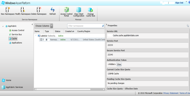 To get started using the Windows Azure AppFabric Caching service, head to portal.appfabriclabs.com. This is the CTP portal that you can use to get familiar with the Caching service. It doesn’t cost anything, but there are no service level agreements for the service.