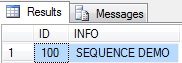 -- CREATE A SEQUENCE WITH INITIAL VALUE 100 AND INCREMENT BY 1 CREATE SEQUENCE [DBO].[DEMOSEQUENCE] AS [BIGINT] START WITH 100 INCREMENT BY 1 -- USE SEQUENCE IN A INSERT STATEMENT CREATE TABLE DEMOTABLE(ID INT,INFO VARCHAR(100)) GO -- INSERT ROWS IN THE DEMOTABLE INSERT INTO DEMOTABLE VALUES(NEXT VALUE FOR DEMOSEQUENCE,'FIRST') INSERT INTO DEMOTABLE VALUES(NEXT VALUE FOR DEMOSEQUENCE,'SECOND') GO -- CONFIRM THE RECORDS SELECT * FROM DEMOTABLE
