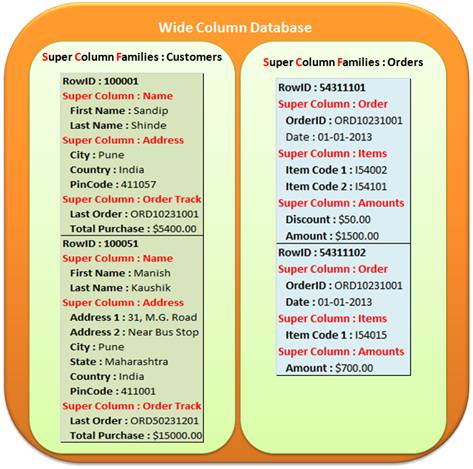 As shown above we have real tables in Wide Column Store and within tables we have rows. In the Key-Value Stores tables called Customers and the columns are almost the same but small difference is every column is a part of a Super Column, that’s why there is super columns called Name, Address and Order Track. If you noticed the second row here has the same schema as the first but there some extra columns added for Super Column Address. So this is again good example of schemaless designing and this is beauty of NoSQL databases. Then we have Super Column Families called Orders and yes again we have done pretty much that same thing here.