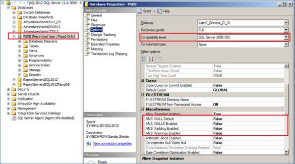 #import SQL Server module Import-Module SQLPS -DisableNameChecking #your SQL Server Instance Name $SQLInstanceName = "SQL2012" $Server = New-Object -TypeName Microsoft.SqlServer.Management.Smo.Server -ArgumentList $SQLInstanceName #provide your database name where you want to change database properties $DatabaseName = "PSDB" #create SMO handle to your database $DBObject = $Server.Databases[$DatabaseName] #Database Options to change ANSI PADDING, NULLS and Warnings $DBObject.DatabaseOptions.AnsiPaddingEnabled = $false $DBObject.DatabaseOptions.AnsiNullsEnabled = $false $DBObject.DatabaseOptions.AnsiWarningsEnabled = $false #Database Options to change Database User Access #DatabaseUserAccess enum :: single, multiple, restricted $DBObject.DatabaseOptions.UserAccess = [Microsoft.SqlServer.Management.Smo.DatabaseUserAccess]:: Restricted $DBObject.Alter() #In some cases you cannot use DatabaseOptions #where you can update your SMO handle directly $DBObject.CompatibilityLevel = [Microsoft.SqlServer.Management.Smo.CompatibilityLevel]::Version90 $DBObject.AutoUpdateStatisticsEnabled =$true $DBObject.Alter() #Set your database ReadOnly with DatabaseOptions $DBObject.DatabaseOptions.ReadOnly = $true $DBObject.Alter()
